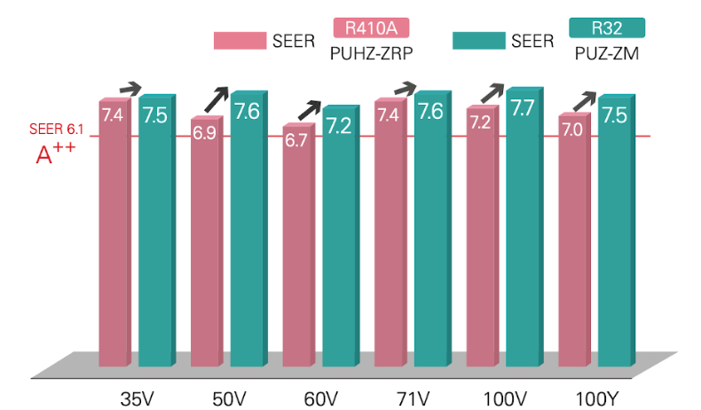 Introduction of new R32 refrigerant reduces energy consumption and realises energy savings.