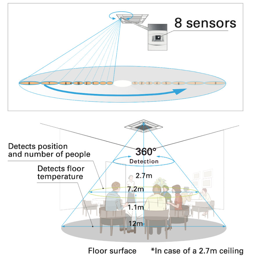 3D i-see Sensor detects the number of people in the room and sets the air-conditioning power accordingly. This makes automatic power-saving operation possible in places where the number of people entering and exiting is large.