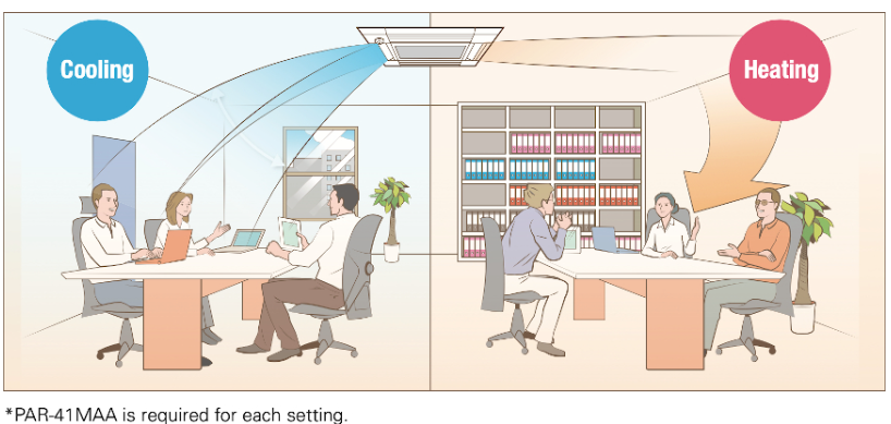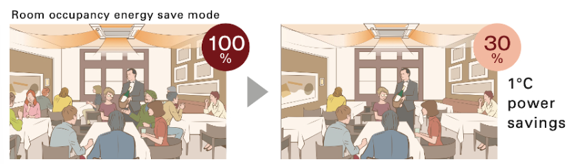 When the occupancy rate is approximately 30%, air-conditioning power equivalent to 1°C during both cooling and heating operation is saved. The temperature is controlled according to the number of people.