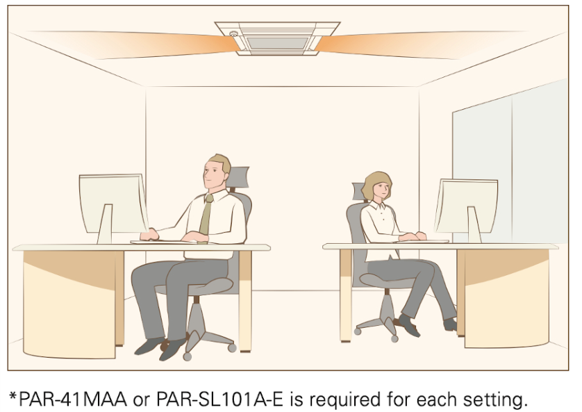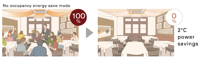 When 3D i-see Sensor detects that no one is in the room, the system is switched to a pre-set power-saving mode. If the room remains unoccupied for more than 60min, air-conditioning power equivalent to 2°C during both cooling and heating operation is saved. This contributes to preventing waste in terms of heating and cooling.