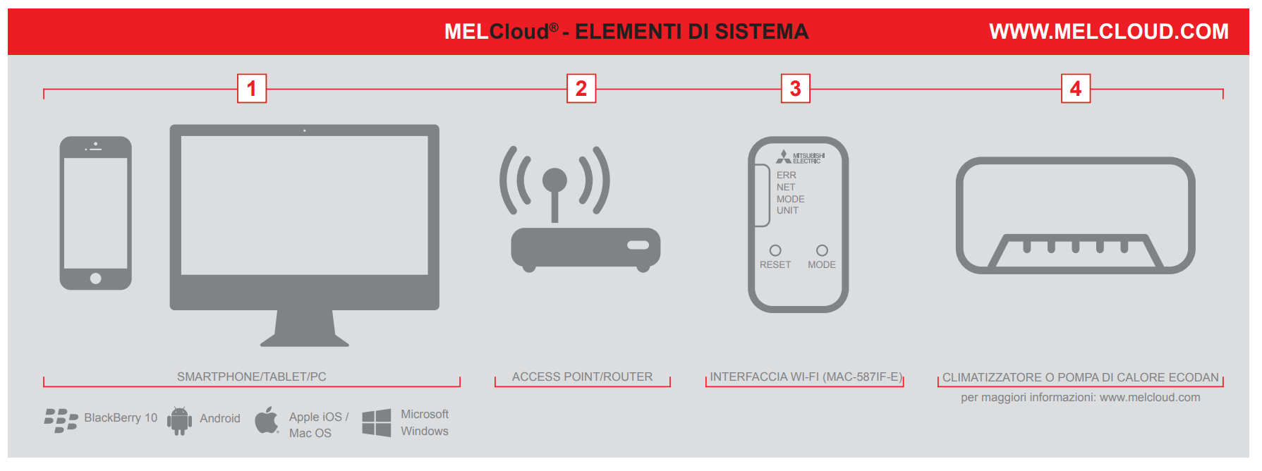 MELCloud is an app that enables system management via smartphones, tablets and PCs, both within the local wi-fi network and remotely.