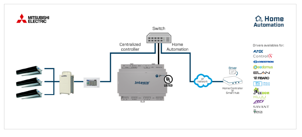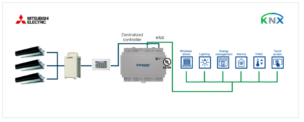 With the ME-AC-MBS-KNX-100 gateway, Mitsubishi Electric's City Multi systems can be easily integrated into an installation based on Modbus TCP, Modbus RTU, KNX, BACnet/IP.