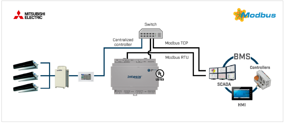 The interface is connected to the Modbus supervisory system via alternately an RS232/RS485 or TCP/IP over Ethernet serial link and via Ethernet to Mitsubishi Electric's VRF City Multi system.
