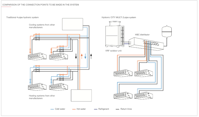 Hydronic CITY MULTI in the Water-Condensed Heat Recovery version is the world's first and only two-pipe system for simultaneous cooling and heating with heat recovery that combines the advantages of the direct expansion system with those of the traditional hydronic system.