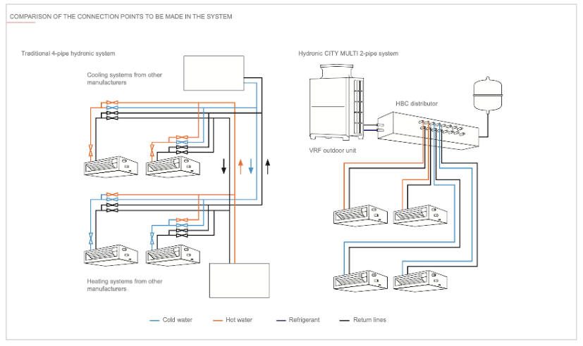 Hydronic City Multi in the Heat Recovery version is the world's first and only two-pipe system for simultaneous cooling and heating with heat recovery that combines the advantages of direct expansion system with those of traditional hydronic system.