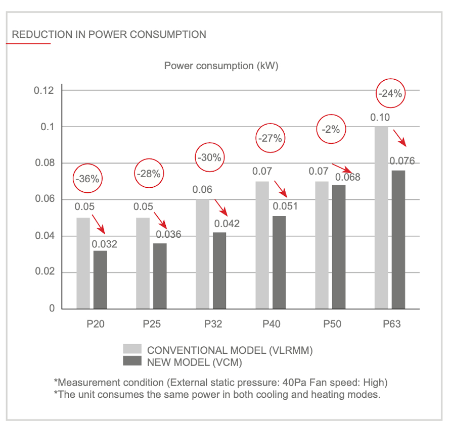 Completely redesigned in terms of chassis and components, the new PFFY-P VCM-E indoor units guarantee a substantial reduction in power consumption and sound pressure in both cooling and heating modes.