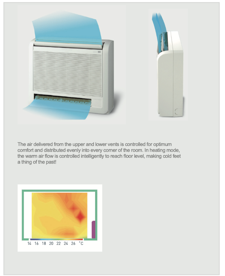 Powerful and effective air distribution realized through the upper and lower air outlets allows for comfortable temperatures inside the room.