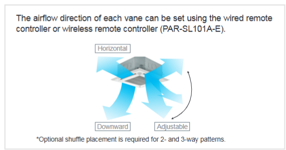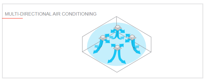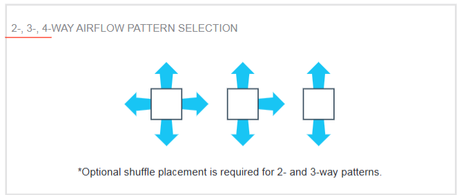 To meet different installation needs, three air outlet options are available: two-way, three-way, and four-way. For example, you can select the four-way scheme for an installation in the center of the room, or the three-way option in case of corner placement.