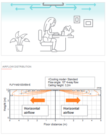 The air is fed horizontally into the room to reduce the feeling of cold draft. This airflow is ideal for offices and restaurants.