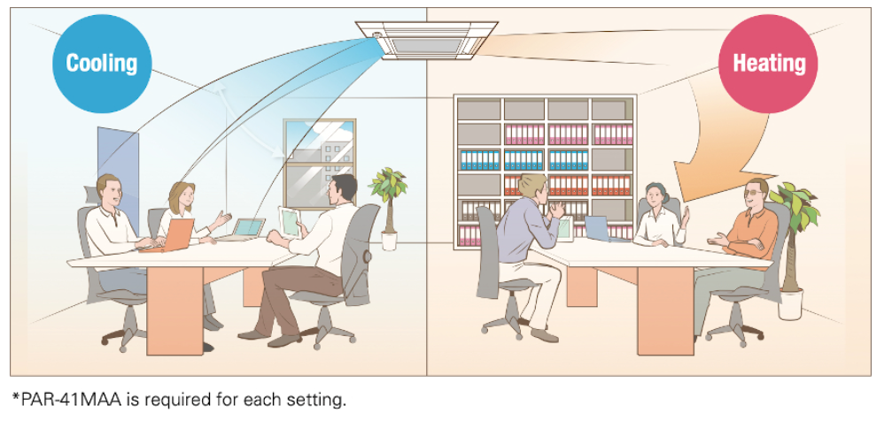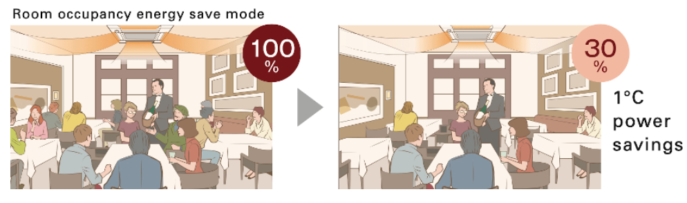 When the occupancy rate is approximately 30%, air-conditioning power equivalent to 1°C during both cooling and heating operation is saved. The temperature is controlled according to the number of people.