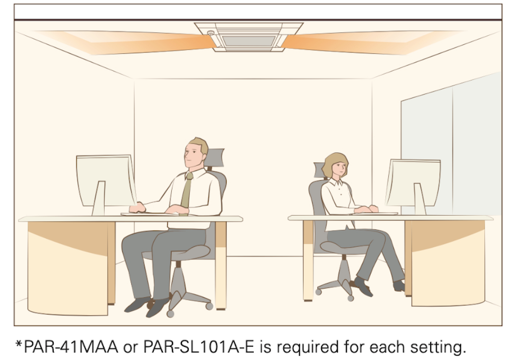 When the room remains unoccupied for a pre-set period of time, the air conditioner turns off automatically, thereby providing even greater power savings. The time until operation is stopped can be set in intervals of 10min, ranging from 60 to 180 min.