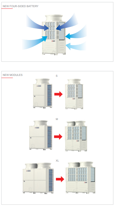 The new outdoor units of the YNW series use a four-sided heat exchanger close to the top of the case near the fan. This technological and construction choice makes it possible to increase heat exchange efficiency.