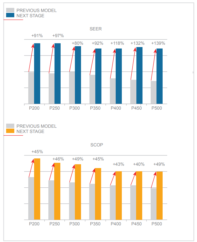 Energy efficiency has been further improved compared to YLM units and now hits top of the range performance values. SEER values have been raised by 139% (P500) compared to the previous model and SCOP values by 49% (P300 and P500). This allows the new YNW units to consume less energy in both cooling and heating. All year-round saving.