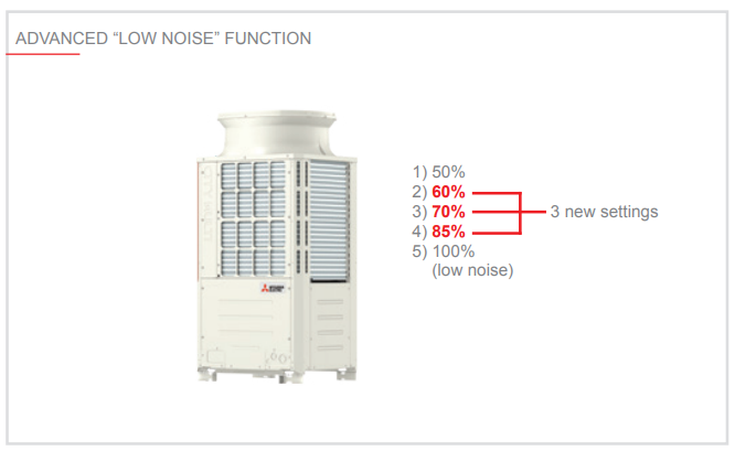 “Low noise” mode can now be selected from five different settings: 85%, 70%, 60% and 50% (values referring to fan speed). Noise reduction is directly configurable from the control board of the outdoor unit. Different settings can be selected based on the installation requirements (in applications with special noise constraints).